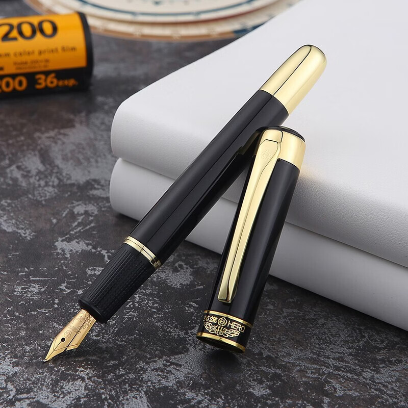 英雄(HERO)【10K金笔】1000钢笔经典暗尖钢笔商务学生练字笔硬笔书法笔签字笔生日礼物可定制钢笔 黑杆金帽10K金笔(约0.5mm)