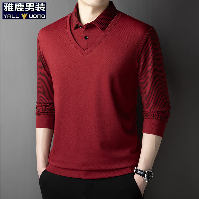 罗蒙(ROMON)加绒加厚保暖针织衫男士冬季中青年衬衫领假两件毛衣打底衫爸爸装 黑色 【加绒款】 XL (175) (建议130-150斤)