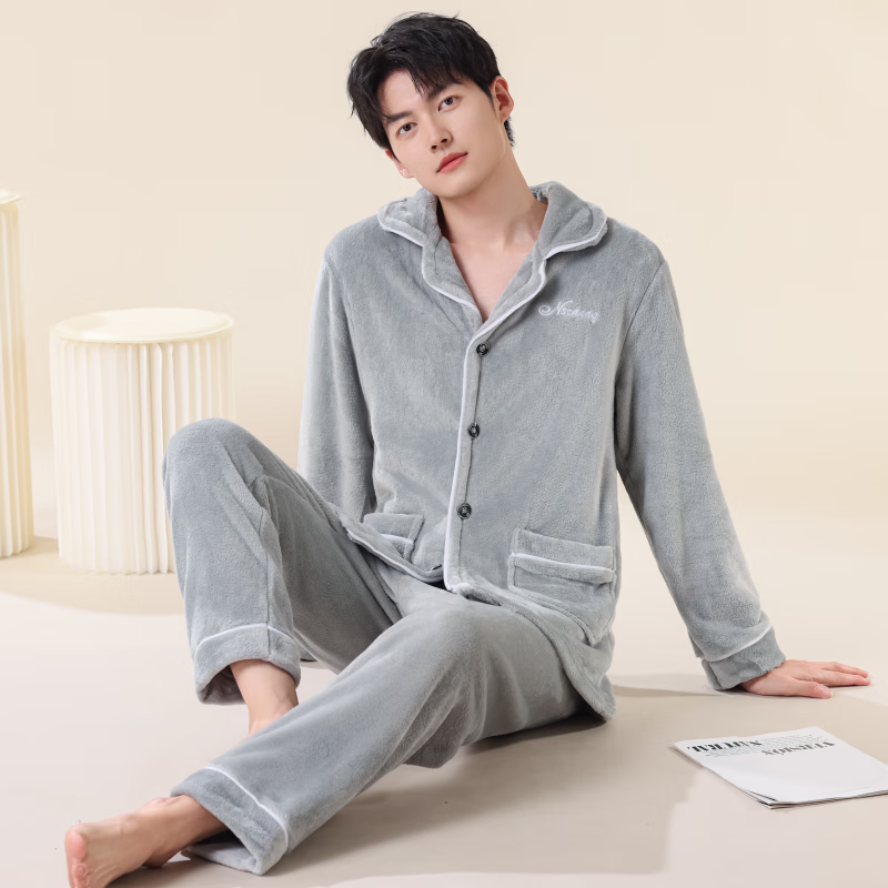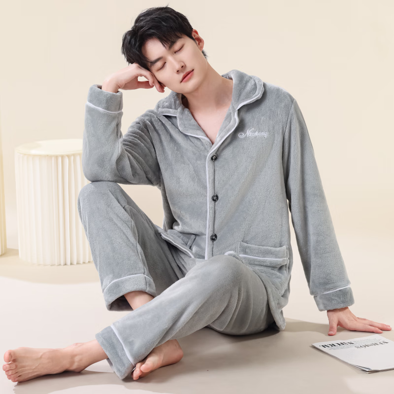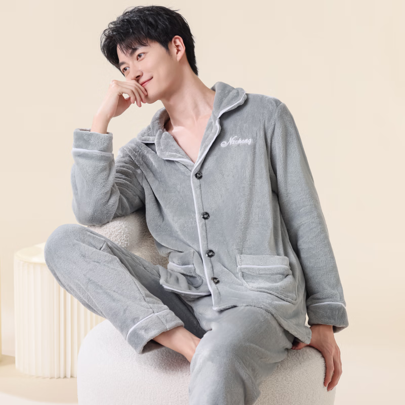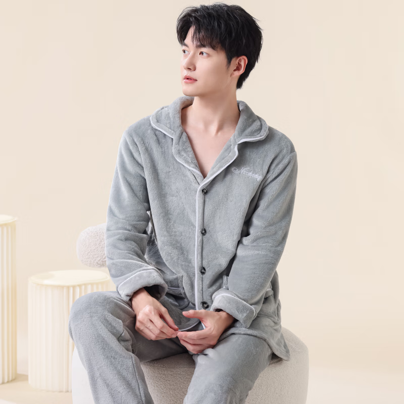 都市丽人家居服情侣款米粒绒开襟上衣厚款保暖外出经典格纹开衫家居服上衣 深普蓝-男 XL